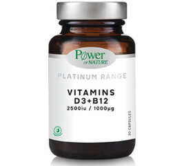 Power of Nature Platinum Range Vitamins D3 & B12 2500iu/1000mg  Συμπλήρωμα διατροφής με  βιταμίνη D3  2.500iu ως χοληκαλσιφερόλη και  βιταμίνη Β12  1000μg ως μεθυλοκοβαλαμίνη για υψηλή βιοδιαθεσιμότητα και απορρόφηση. Για την  ενίσχυση του ανοσοποιητικού...