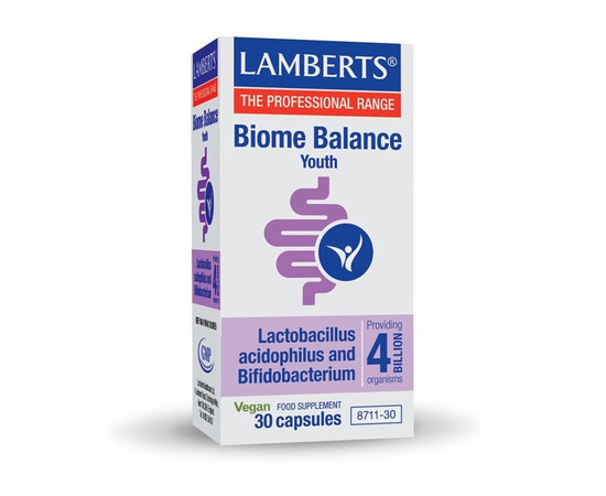 Το Biome Balance Youth της Lamberts® αποτελεί ένα σκεύασμα φιλικών βακτηρίων χωρίς προσθήκη γάλακτος, που περιέχει 4 δισεκατομμύρια βακτήρια ανά κάψουλα (κατά τη στιγμή της παρασκευής).